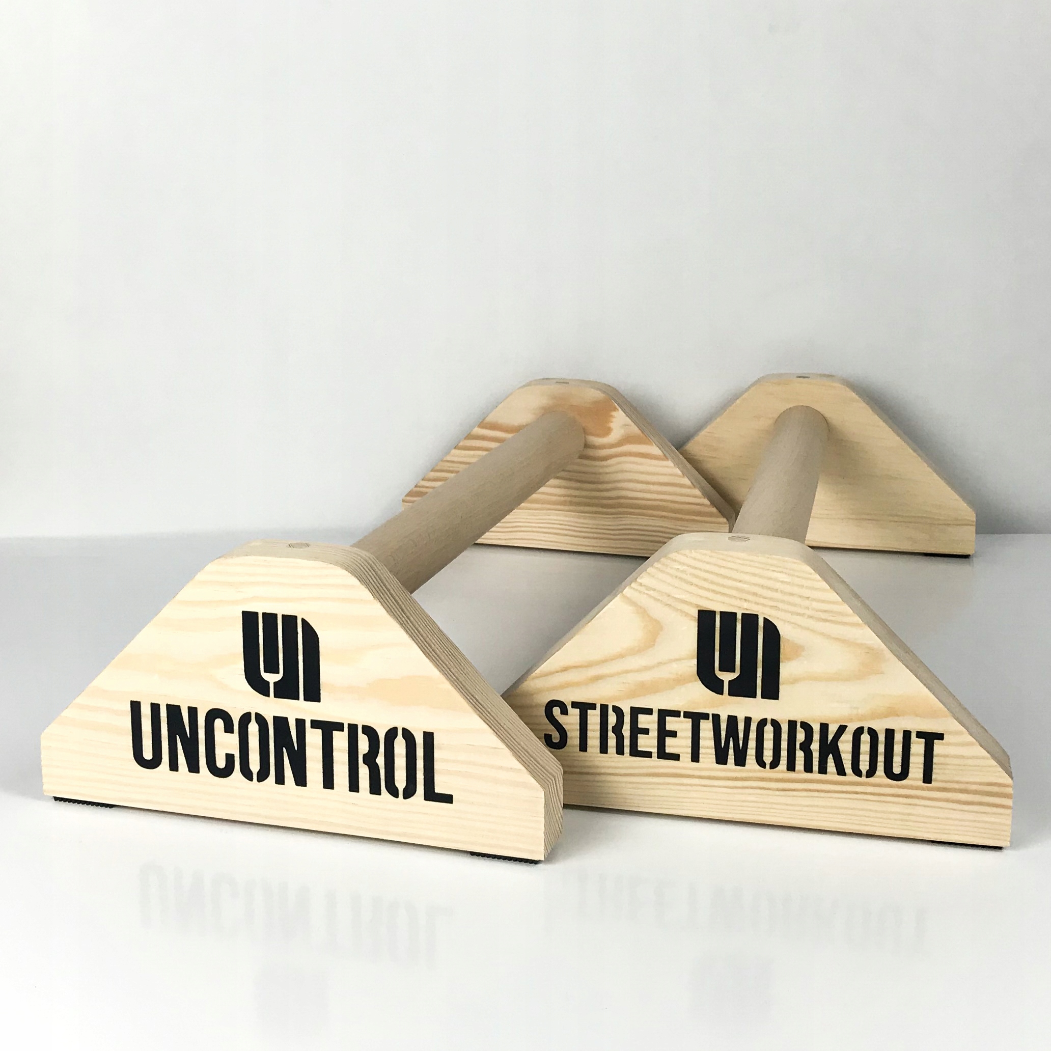 Profejsonalne drewniane poręcze/paraletki do ćwiczeń, Street Workoutu i Kalisteniki (komplet 2 sztuki). Wykonane ze starannością, estetyką oraz ze względu na zwiększoną wytrzymałość. Z jednej strony napis UNCONTROL, a z drugiej STREET WORKOUT.