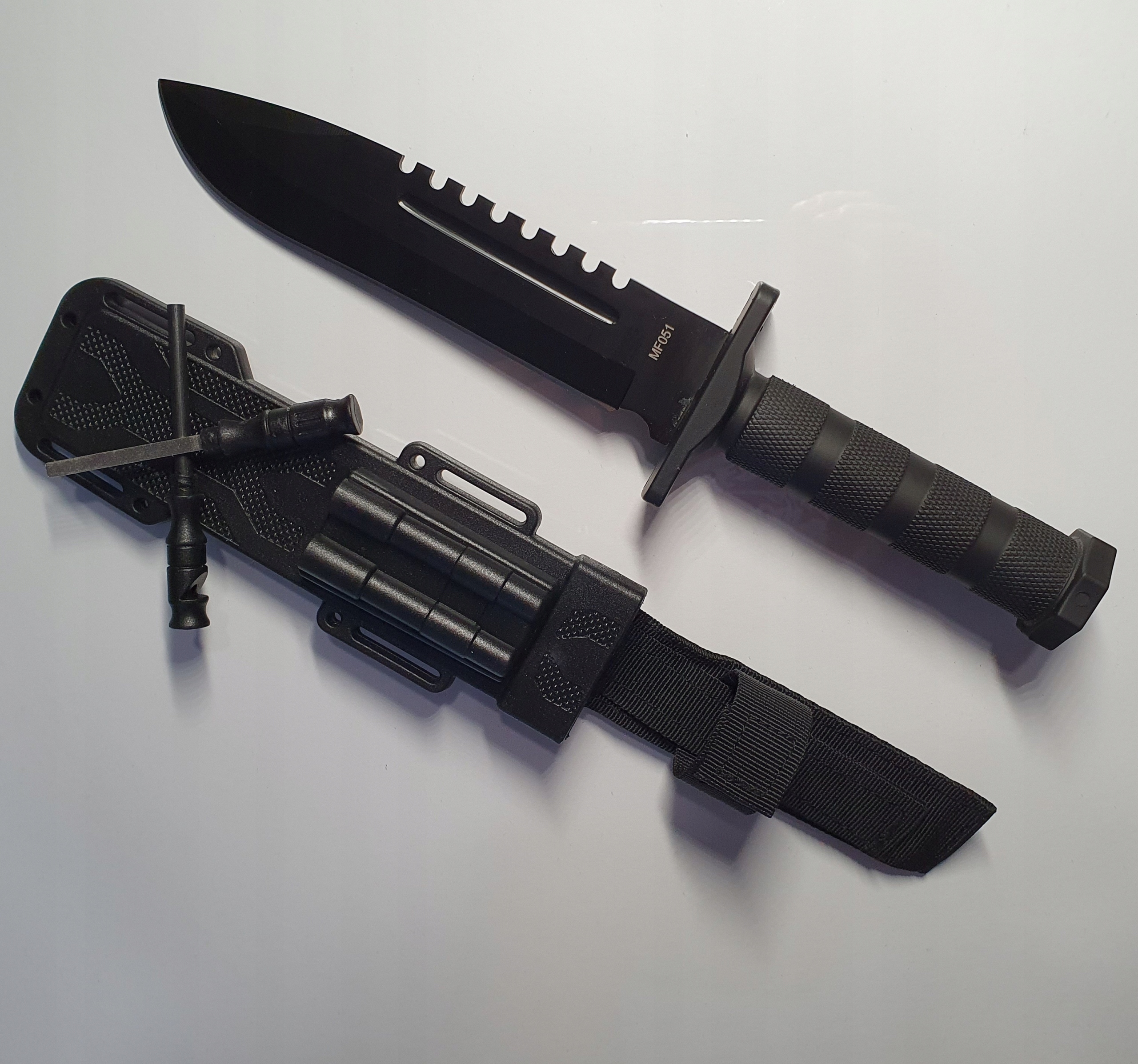 Dodatkowo nóż wyposażony jest w krzesiwo magnezowe, ostrzałkę oraz gwizdek ratowniczy w pokrowcu w miejscu przeznaczonym do tego.