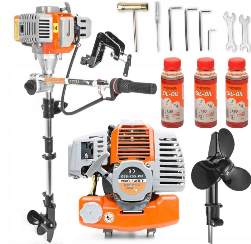 Oferujemy Państwu nowy 2-suwowy zaburtowy silnik spalinowy niemieckiej firmy GERMAN o mocy 5,8 KM. Jego kompaktowa budowa zapewnia łatwe przenoszenie i łatwość montażu na łodzi lub pontonie. Brak osłon silnika to bardzo praktyczne rozwiązanie pozwalające na łatwą kontrolę podzespołów.. Prosta konstrukcja pozostawiła tylko niezbędne elementy co pozytywnie wpływa na bezawaryjność. Chłodzenie powietrzem wyeliminowało problemy z wirnikami pompy wody i przegrzewaniem. Napęd jest przenoszony przez skrzynię biegów z położeniami: przód - bieg jałowy - wsteczny. Napęd jest przenoszony w prosty sposób przez sprzęgło odśrodkowe a uciąg wsteczny uzyskujemy przez odwrócenie silnika o 180 stopni. Manetka gazu umożliwia łatwe ustawie obrotów silnika na dowolnym poziomie bez konieczności ciągłego trzymania ręką. Śruba dociskowa steru umożliwia zablokowanie kierunku płynięcia. Wieloletnie doświadczenie firmy zaowocowało doskonałym połączeniem niskiej ceny i najwyższej jakości spełniającej wszystkie normy europejskie. Silnik jest objęty pełnym pakietem gwarancyjym na 2 lata i nie wymaga przeglądów w autoryzowanych warsztatach. Jedyną czynnością serwisową jest prosta wymiana oleju w silniku i w stopie - co można zrobić samodzielnie. Wszystkie części zamienne posiadamy "od ręki" na magazynie a ich ceny są bardzo niskie np.: gaźnik kompletny: 40zł, rozrusznik kompletny: 30zł, śruba napędowa: 50zł.
