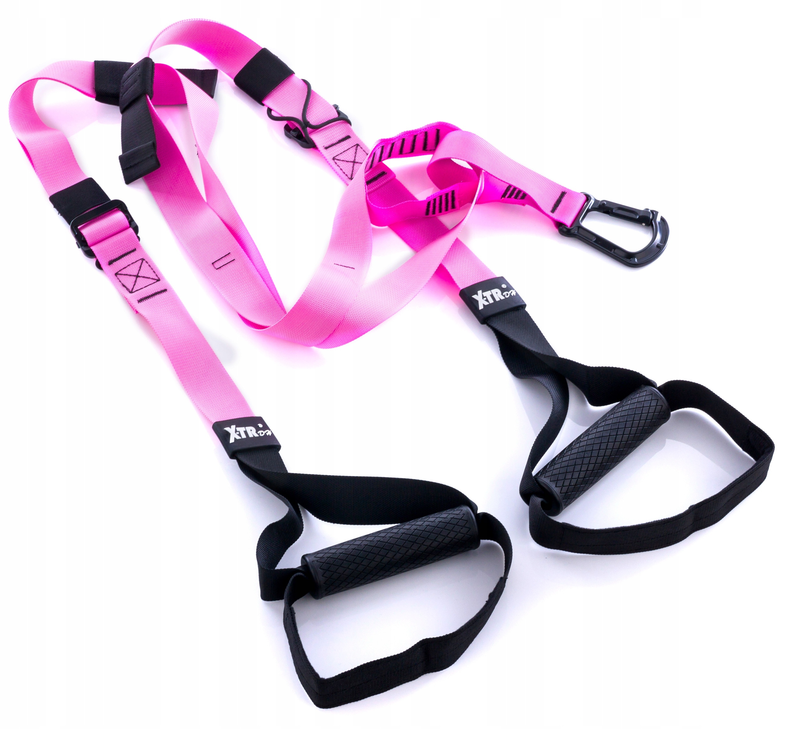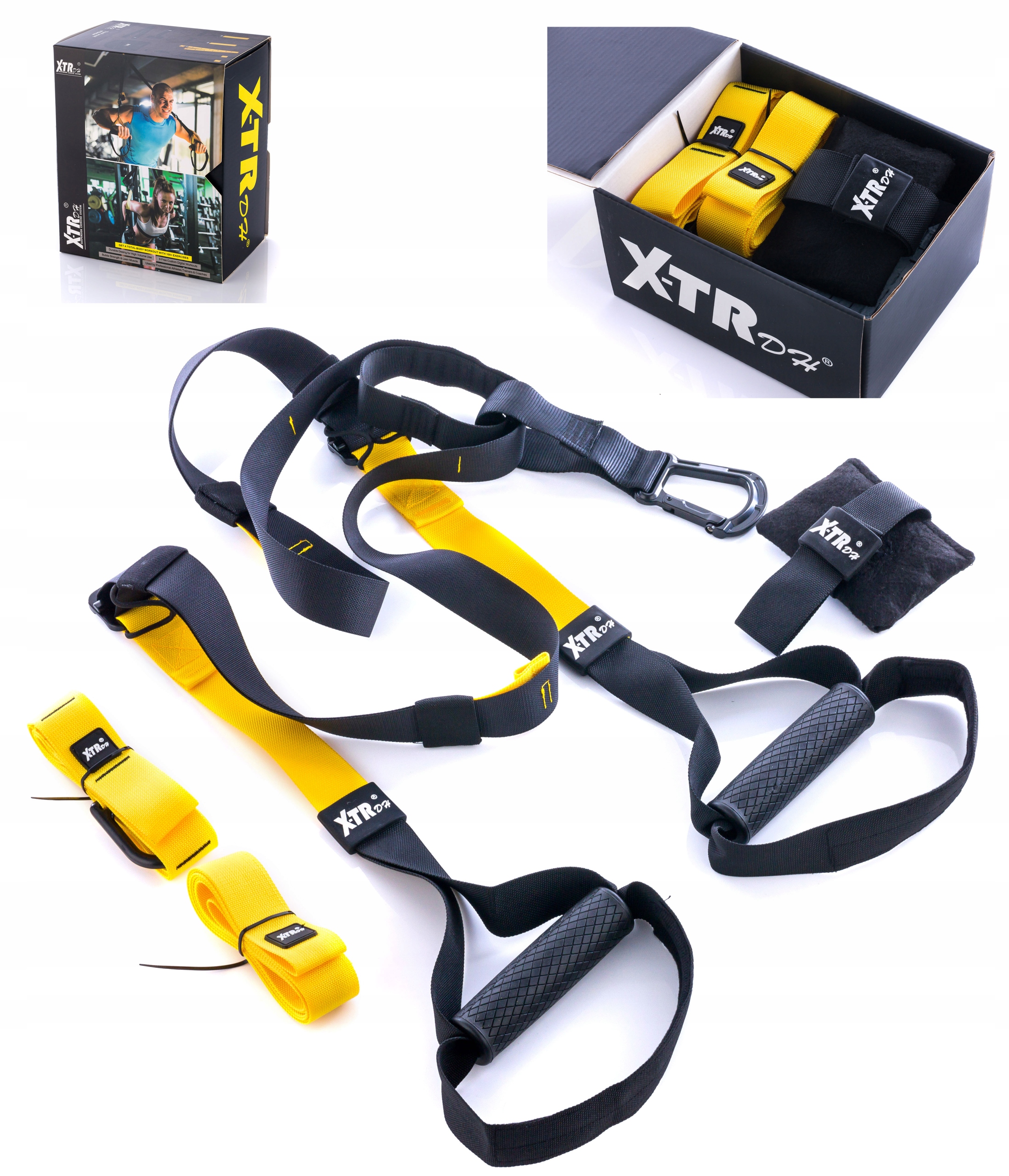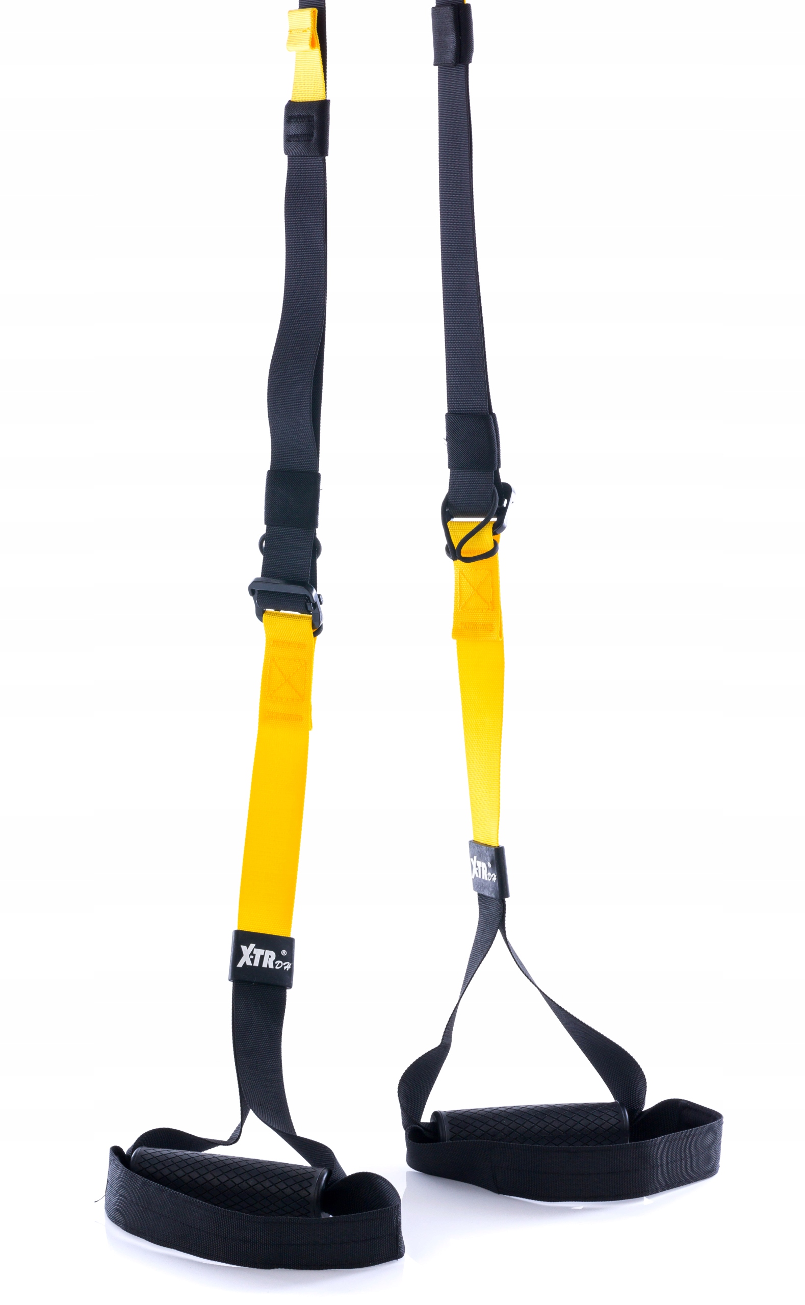 Zestaw taśm X-TR składa się z taśmy głównej zakończonej gumowymi uchwytami, dodatkowej taśmy przedłużającej która zapewnia możliwość mocowania w wysokich pomieszczeniach lub do bardziej oddalonych obiektów oraz taśmy z blokadą do drzwi dzięki której przeprowadzisz trening w warunkach domowych lub w hotelu.
