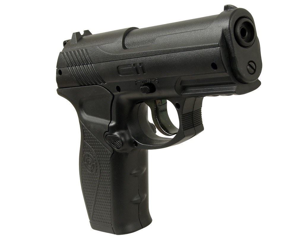 Wykonany z plastiku, na którym osadzono również wykonany z tworzywa sztucznego optyczny osprzęt, nie wymaga on posiadania zezwolenia. Na muszce umieszczono białą kropkę. Crosman C11 – doskonała broń zapewniająca wiele rozrywki za niewielką cenę Jeden z potężniejszych pistoletów zasilanych CO2 skonstruowanych "dla rozrywki". Nieznaczna masa i wymiary modelu niemal pozwalają na to, by nosić go ze sobą w kieszeni.