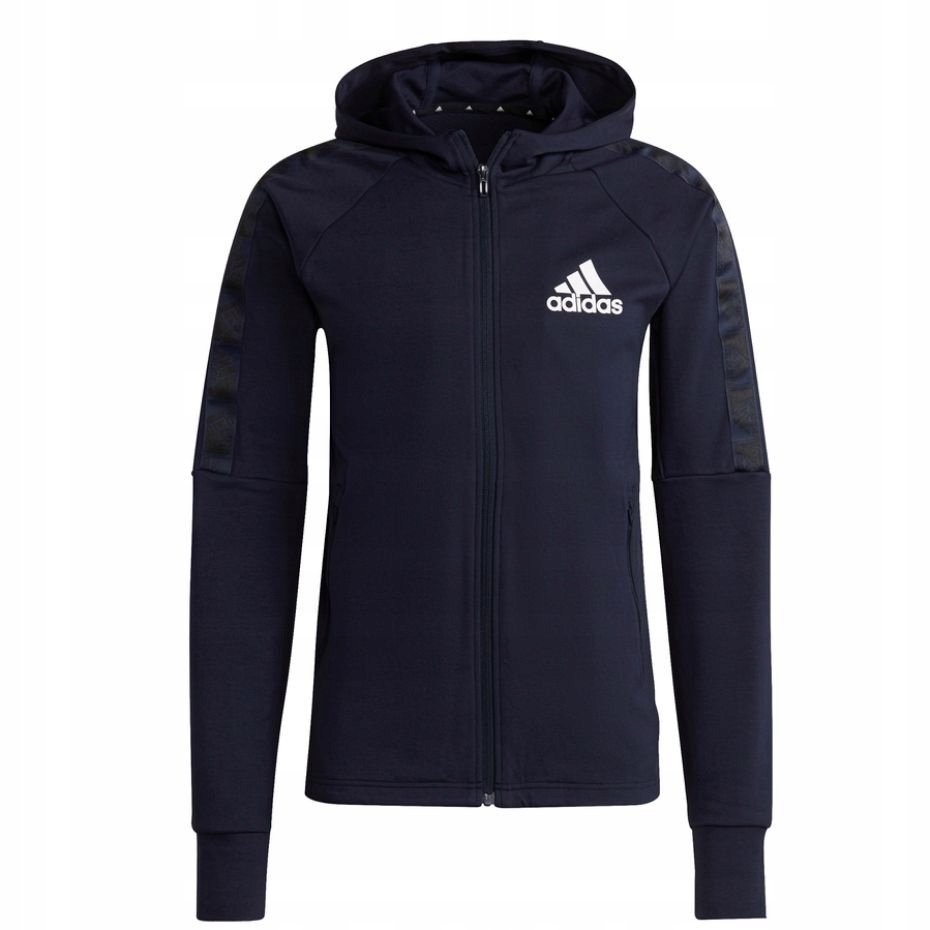 Prowadzisz intensywny tryb życia, w którym nie ma miejsca na dyskomfort? Jeśli tak, to koniecznie uzupełnij garderobę o te męską bluzę treningową adidas, która poza wygodą zaoferuje Ci również wsparcie w czasie aktywności. Miękka tkanina to mieszanka bawełny i poliestrowych włókien. Takie połączenia wpływa na trwałość oraz dba o odpowiednią wentylację ciała i minimalizuje ryzyko wystąpienia podrażnień na skórze. Wsparcie technologii AeroReady ma za zadanie odprowadzać wilgoć na zewnątrz, zapewniając CI tym samym suchy komfort, nawet w trakcie intensywnego wysiłku. Klasyczny krój nie pozbawi Cię pełnego zakresu ruchów. Suwak na całej długości pozwala na indywidualną termoregulację zgodną z własnymi preferencjami. Zintegrowany kaptur ochroni twoją głowę przed niekorzystnymi warunkami atmosferycznymi, takimi jak wiatr czy lekki deszcz. Dwie kieszenie zapinane na zamek to idealne miejsce do przechowywania drobiazgów, które chcesz mieć zawsze pod ręką. Dodatkowym atutem tego modelu są otwory na kciuki ulokowane w mankietach, które pozwolą na utrzymanie bluzy na miejscu w trakcie aktywności. Model w kolorze granatowym prezentuje ponadczasowy styl, a logo producenta podkreśla jego sportowy wymiar. Ciesz się ciepłym komfortem i swobodą ruchu podczas treningu, wybierając tę męską bluzę adidas!