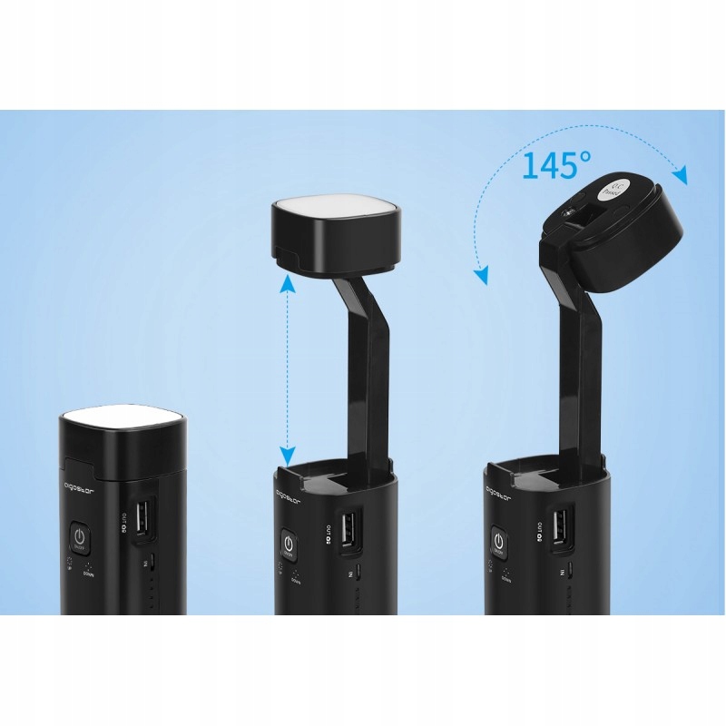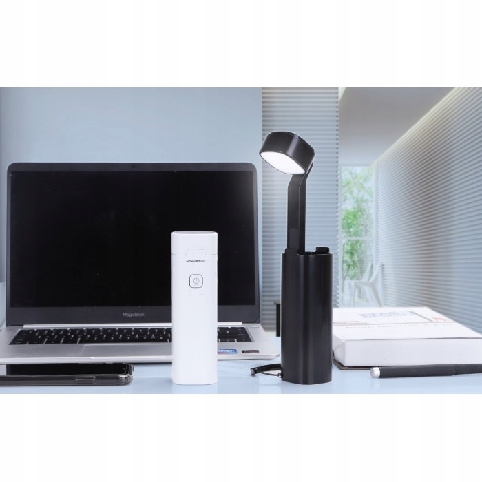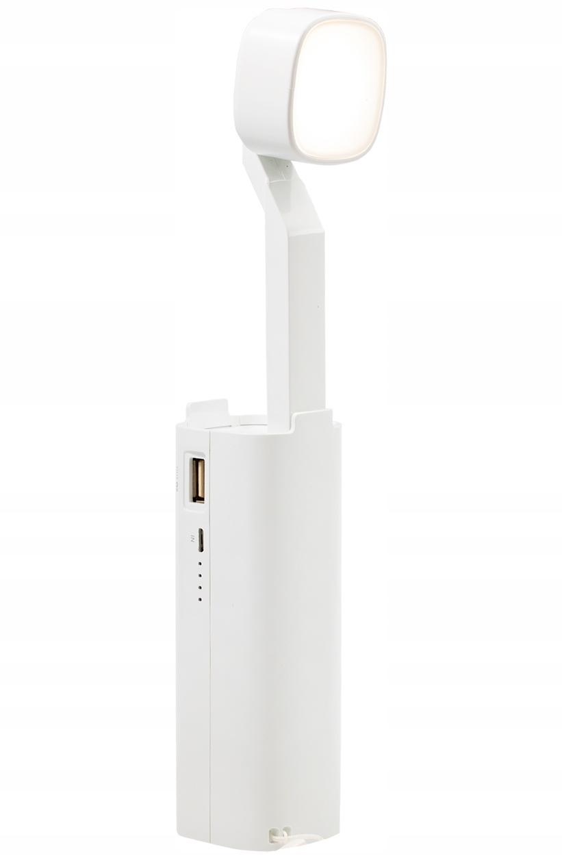 Wielofunkcyjne kompaktowe urządzenie które może służyć jako : Lampka biurkowa, latarka, power bank oraz uchwyt na telefon. Zintegrowane źródło światła o mocy 3W jest filtrowane przez miękką płytkę oprawy dzięki której uzyskujemy neutralną barwę światła. Bateria zapewnia 20 godz. pracy w normalnym trybie użytkowania, przy bardzo wysokim natężeniu oświetlenia czas pracy wynosi 15 godzin. Głowicę lampki możemy wysuwać i obracać o 145° daje nam to możliwość dopasowania kąta światła do własnych potrzeb.