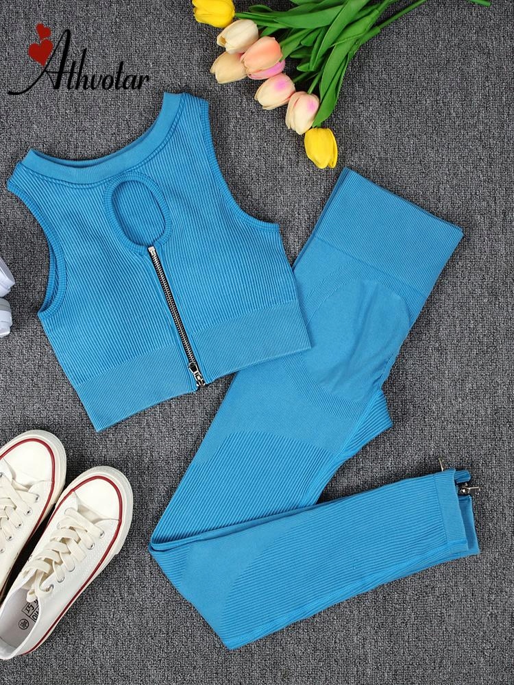 ATHVOTAR Zipper Wash Seamless Workout Set Sports Suits for Fitness Ribbed Leggings and Shock-Proof Bra Gym Outfit Women