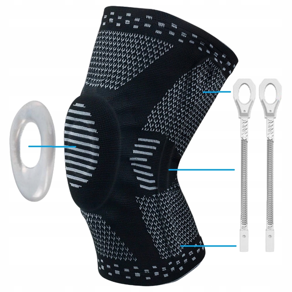 - cechy: żelowo silikonowa wstawka stabilizująca rzepkę, boczne wstawki sprężynujące z elastycznego materiału dla poprawy stabilizacji zgięciowej, oddychający materiał,