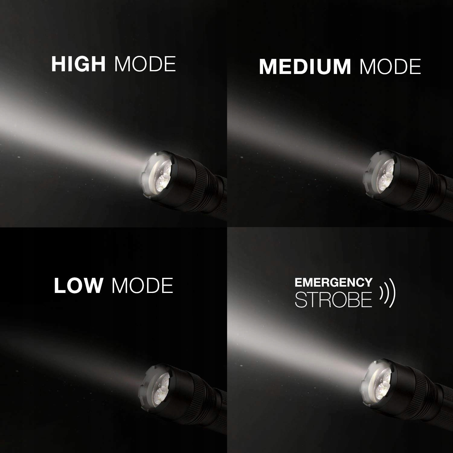 - Ta wydajna latarka oferująca cztery różne tryby oświetlenia (wysoki, średni, niski i awaryjny stroboskopowy) jest idealnym rozwiązaniem do zastosowań zewnętrznych i wewnętrznych, w tym do majsterkowania oraz innych prac.