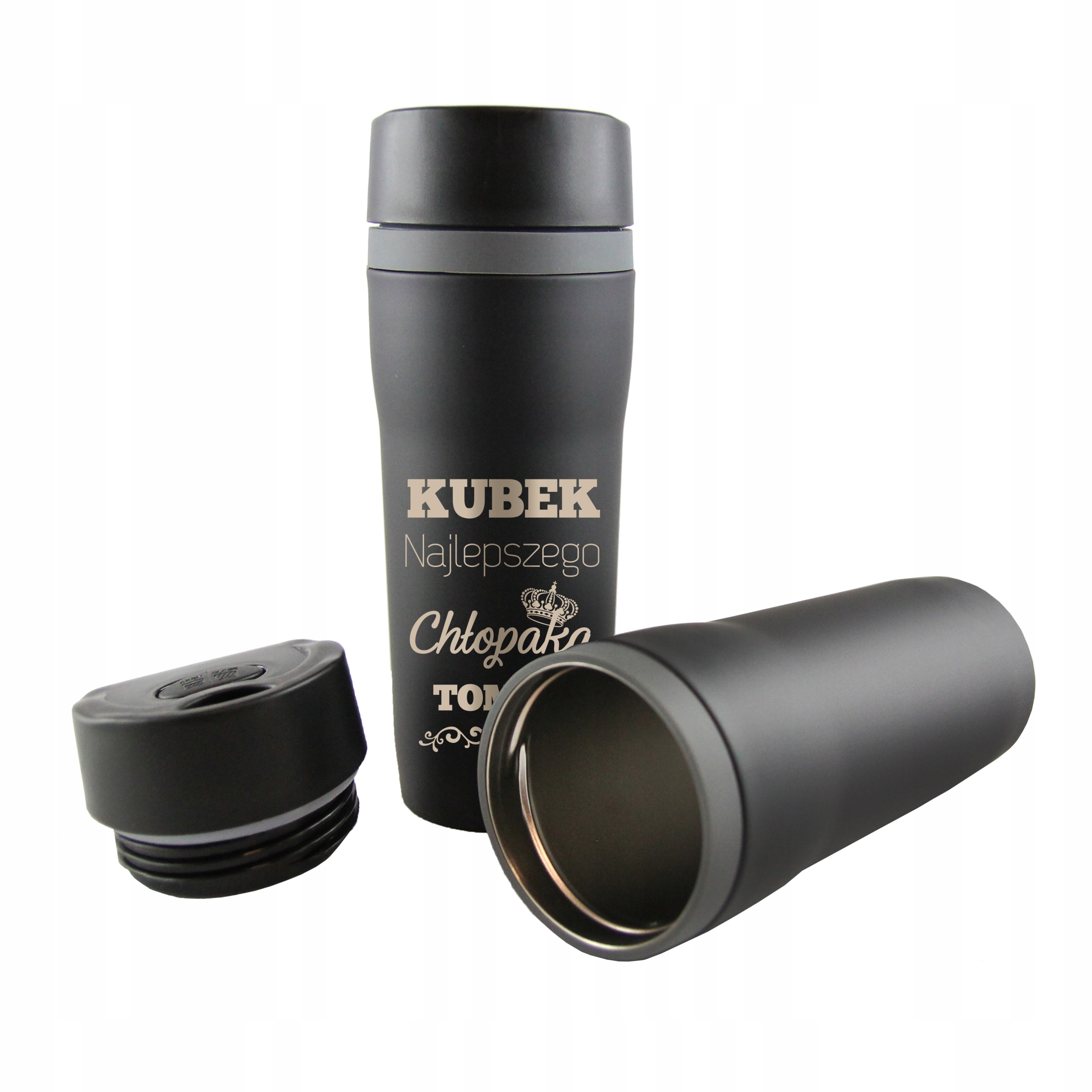 PAMIĘTAJ! Umiejscowienie wygrawerowanej grafiki na zdjęciach względem zamknięcia kubka jest wyłącznie poglądowe. Położenie grafiki na gotowym produkcie nie jest podstawą do reklamacji towaru jako niepełnowartościowy, ponieważ takie przesunięcia mogą wynikać z możliwości produkcyjnych bądź ze specyfikacji produktu – uszczelka pozwala na dokręcanie kubka bardziej lub mniej, w zależności od tego ile siły zostanie użyte. Ponadto w trakcie użytkowania – pod wpływem ciepłego płynu oraz pracy uszczelki, położenie grawera względem nakrętki może ulec zmianie.