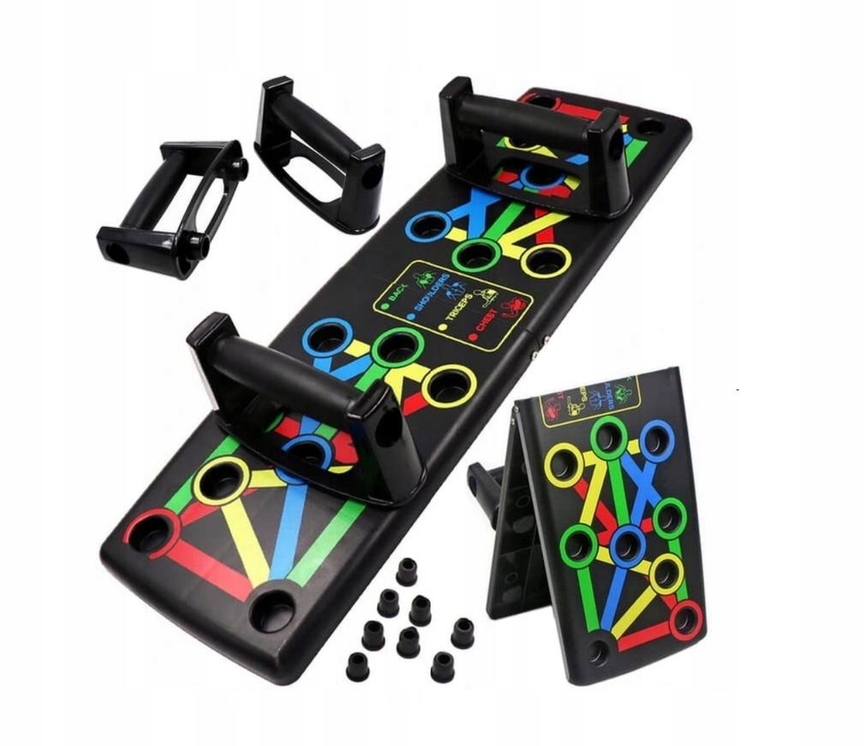Deska do pompek 14w1 to perfekcyjne uzupełnienie domowego arsenału sprzętu do ćwiczeń. Dzięki specjalnemu systemowi "Plug & Press" można zastosować wiele różnych kombinacji podparcia, z których każde angażuje poszczególne partie mięśni. Wszystkie kombinacje są bardzo czytelnie przedstawione na desce i można błyskawicznie dostosować ułożenie do treningu w danym dniu.