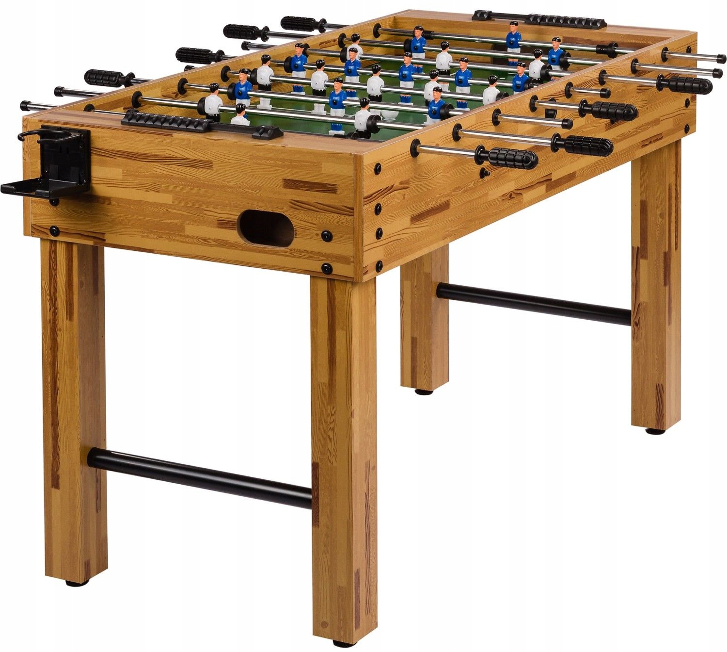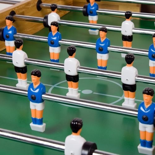 Korpus piłkarzyków wykonany jest z wysokiej jakości utwardzanej płyty MDF, pokrytej warstwą laminatu a więc jest odporny na ścieranie. Pole gry jest wzmocnione od spodu dwoma poprzecznymi metalowymi prętami co znacznie poprawia ich stabilność oraz trwałość. Posiada wygodne otwory z tyłu bramek do wyciągania piłeczki po strzeleniu gola. Nie jest to stół tylko dla dzieci i młodzieży - jest w pełni funkcjonalny również przy grze dorosłych. Wysokiej jakości gumowane rączki zabezpieczają ręce przez ześlizgiwaniem.