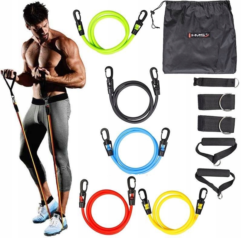 Gumy wykorzystują masę ciała użytkownika do poprawienia jego sprawności i siły. Wysoka jakość, przemyślana konstrukcja i trwałość są gwarantem udanego treningu w każdych warunkach. W skład zestawu wchodzi 5 gum oporowych, dwa uchwyty na ręce, dwa uchwyty na kostkę oraz jeden uchwyt pod drzwi.