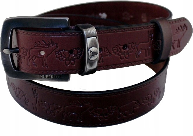 Skórzany pas myśliwski zdobiony wizerunkami zwierząt przeplatanymi liściami dębu. Pas posiada solidną metalową klamrę.