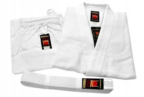Kimono/Judoga do treningu Aikido, Jujitsu i Judo w rozmiarze 160 cm w kolorze białym. Luźna bluza gruba, wytrzymała z plecionki z długimi rękawami. Spodnie na gumce ze sznurkiem umożliwiającym lepsze dopasowanie rozmiaru w pasie oraz ze wszywkami na kolanach dla lepszego umocnienia. Wykończenie standardowe. Do tego biały pas. Zrobione z bawełny 100%, plecionka. Rozmiar rękawów 154 cm, długość bluzy 80 cm, długość spodni 96 cm. Wszywka firmowa z boku na spodniach i na bluzie na dole w rogu oraz na pasie. Płeć: chłopak, dziewczyna, mężczyzna, kobieta. Nowa, bez żadnych plam, uszkodzeń, roztarć. Polecam bardzo dobra jakość i firma.