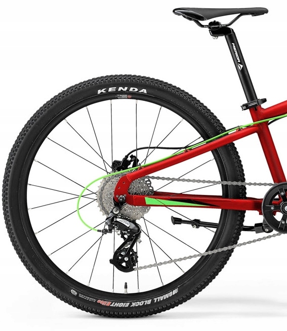 INFORMACJE DODATKOWE aluminiowa rama J. 24+ o niskim przekroku ułatwiająca wsiadanie i zsiadanie z roweru; koła 24” i nisko osadzony suport dla stabilnego zachowania roweru na trasie; widelec SR Suntour XCT-JR DS, Custom coil, 50 mm; napęd 1 x 8 z przerzutką Shimano Altus RD-M310; hydrauliczne hamulce tarczowe Tektro M275 z manetkami dopasowanymi do dłoni młodych rowerzystów; pozostałe komponenty dostosowane do potrzeb dzieci; opony Kenda 24 x 1,95”; rower ma stopkę, można w nim założyć koszyk na bidon, błotniki i bagażnik