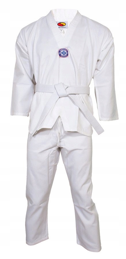 Klasyczne kimono / dobok do taekwondo dla osób początkujących o gramaturze 8oz (227g/m2) w kolorze białym. Idealne do treningu zarówno dla kobiet jak i mężczyzn. Bluza z wzmocnionym kołnierzykiem, spodnie na gumce z dodatkowym sznurkiem do wiązania.