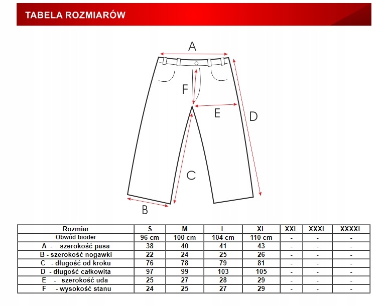 Spodnie mierzone są po zewnętrznej stronie wyrobu !!!