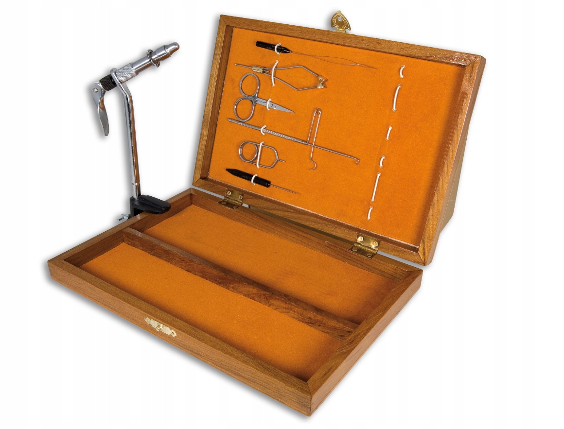 Wysokiej jakości zestaw muchowy składający się z wszystkich narzędzi które są potrzebne do własnoręcznego wykonania much. W skład zestawu wchodzą: różnego rodzaju narzędzia. Zestaw jest spakowany w bardzo ładne pudełko drewniane idealne na prezent.