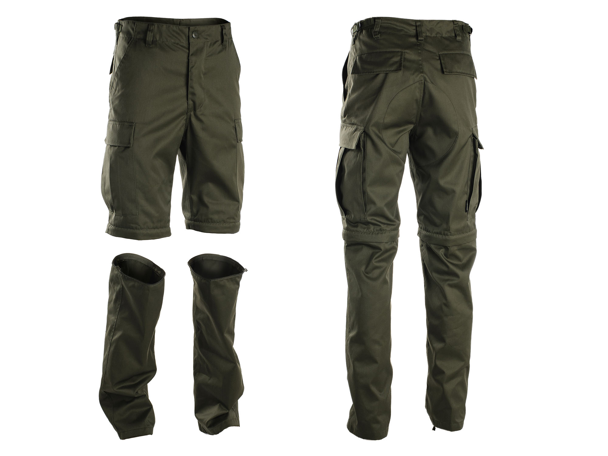 Uniwersalne spodnie trekkingowe z odpinanymi nogawkami. Produkt niemieckiej firmy Mil-Tec®. Krój zaadaptowany z legendarnych spodni wojskowych BDU (Battle Dress Uniform) - klasyczny wzór wprowadzony na potrzeby US Army. Specyfikacja militarna gwarantuje solidność wykonania. Polecane miłośnikom pieszych wędrówek, survivalu, outdoor'u, wędkarzom oraz każdemu kto spędza aktywnie czas. Charakteryzują się świetnym uniwersalnym krojem, wytrzymałością, wygodą i dobrym wykonaniem. Bardzo wytrzymały materiał POLI-CO o gęstym splocie. Opcja odpinania nogawek szczególnie przydatna w górach oraz wiosną i jesienią gdy następują duże wahania temperatur. Nogawki odpinane za pomocą solidnych zamków. Ekspresy ukryte pod zaszewką materiału - zamaskowane. Spodnie wyposażone w sześć kieszeni, dwie klasyczne, dwie tylne oraz dwie boczne o zwiększonej ładowności. Kieszenie boczne typu CARGO wyposażone w zaszewki powiększające. Zarówno kieszenie tylne jak i boczne zamykane patkami na guziki. Wzmocnienie w postaci podwójnego materiału na tyłku oraz w kroku. Mocny materiał i dodatkowe przeszycia w newralgicznych miejscach gwarantują długowieczność użytkowania. Obustronne taśmy do szybkiej regulacji obwodu w pasie pozwalają dopasować spodnie do różnych sylwetek. U dołu wszyto regulowany ściągacz umożliwiający noszenie nogawek na bucie bądź w ich wnętrzu.