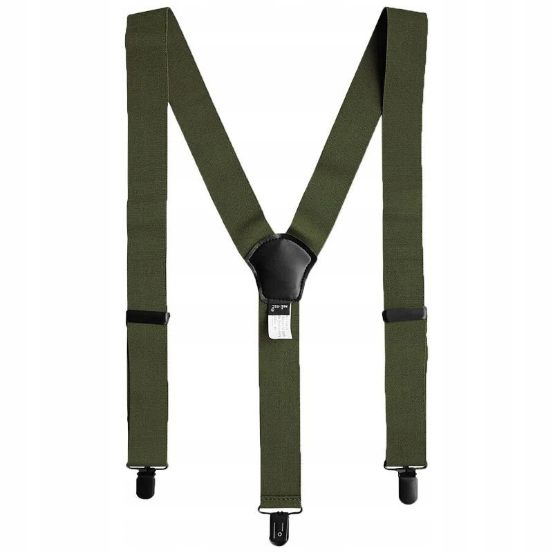 Wytrzymałe szelki z metalowymi klipsami, wykonane z elastycznej taśmy w kolorze olive.