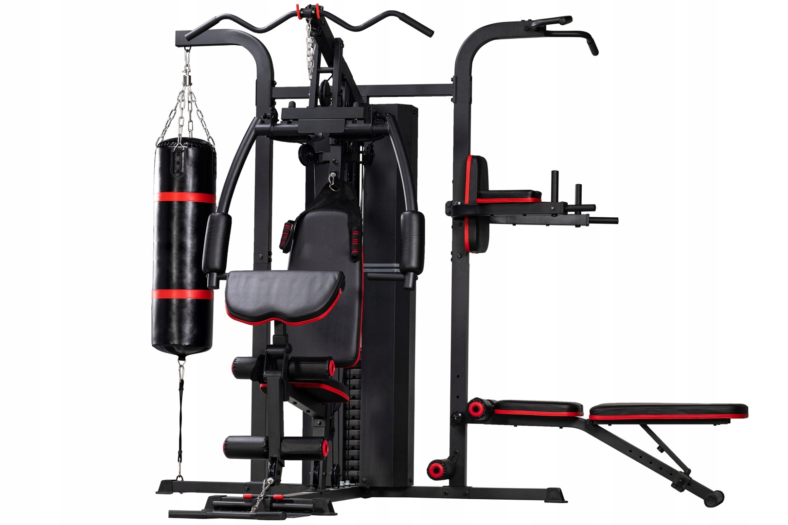 Atlas został wyposażony w stację motylkową, wyciąg górny, wyciąg dolny, ławkę prostą, ławkę dolną, poręcze, drążek do podciągania, worek bokserski, prostownik nóg oraz modlitewnik dzięki czemu wytrenujesz całe ciało na jednym urządzeniu. Atlas od firmy Tag to wysokiej jakości sprzęt treningowy wyróżniający się bardzo dobrze dobranym layoutem.