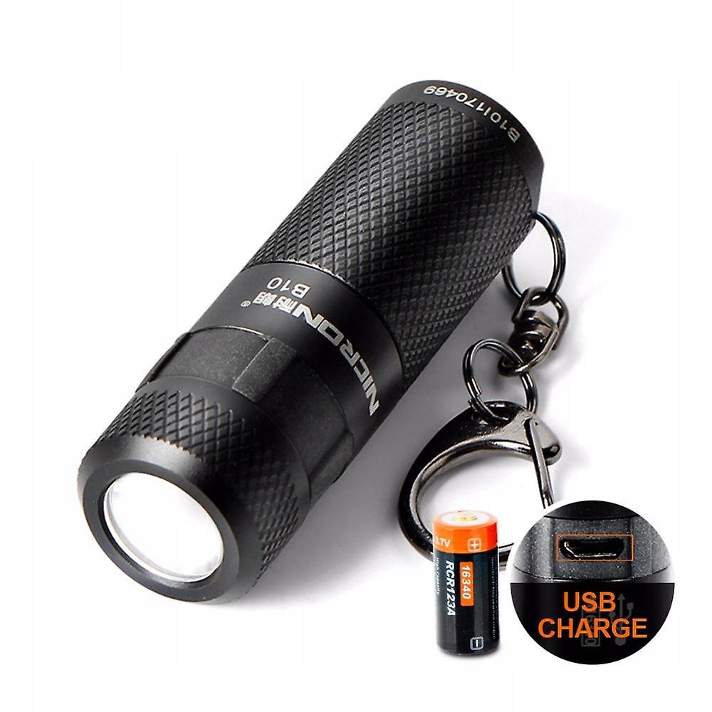 Nicron B10 XP-E2 R3 200LM 5Modes Dimming USB Rechargeable Mini Keychain EDC LED FlashlightSpecification:Product name:Nicron B10 XP-E2 R3 Dimming USB Mini Keychain EDC LED FlashlightBrand:NicronModel:B10Emitter Type:XP-E2 R3Peak Beam Intensity:2000 CDWattage:3 WMax Output:200 LumensRange:90 MetersMode:High, Medium, Low, Strobe, SOSLumens:200LM, 100LM, 30LM, / , 200LM.Runtime:2H, 4H, 10H, / , / .Battery Configurations:1x 16340 / CR123A Battery (Not included)Switch Type:RotateSwitch Location:Head of the flashlightMaterial:Aluminium alloyImpact Resistant:1 MeterWaterproof:IPX4Lens:GlassReflector:Flood light reflectorCarrying Strap:Key chainColor:BlackWeight:19g (Excluding battery)Size:65mmx 20mm(Lengthx Diameter)Additional functions:Mini keychain does not take up space, easy to carry.
