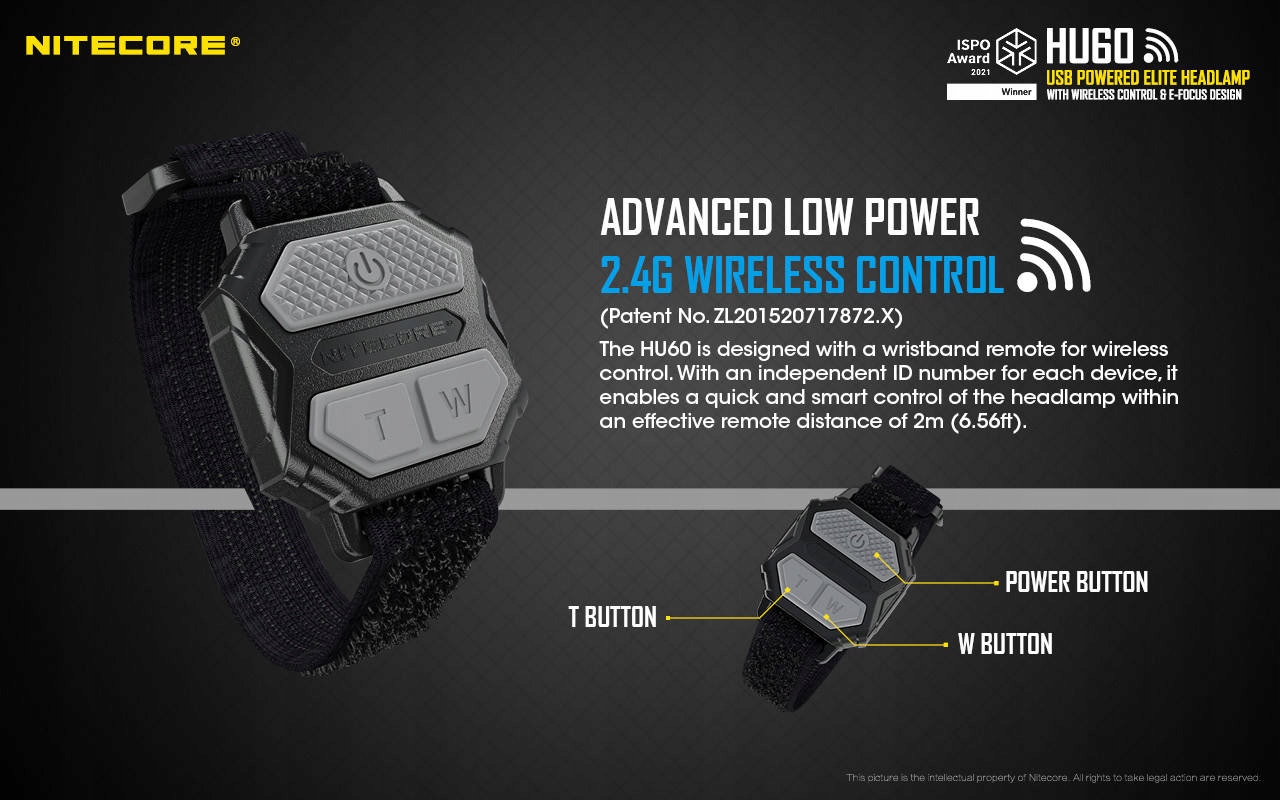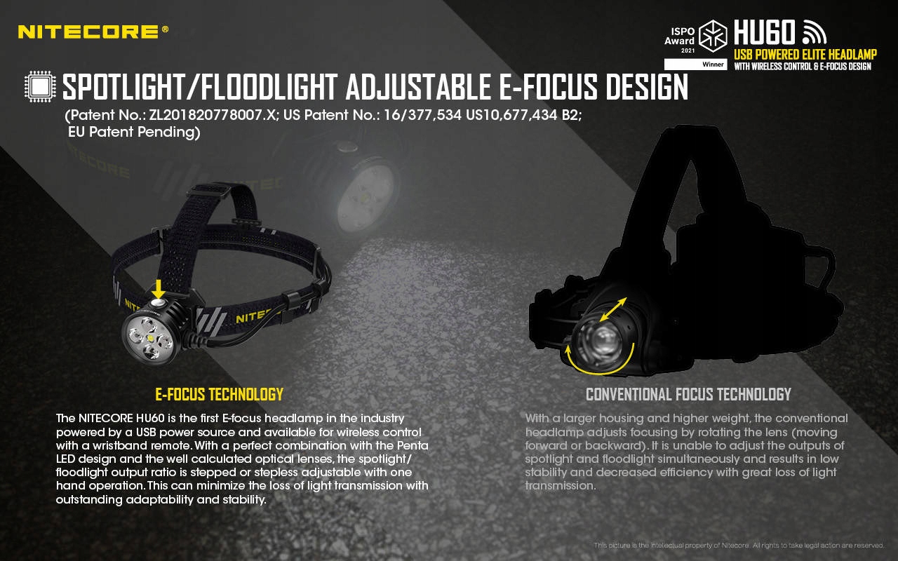 Nowoczesna latarka czołowa HU60 generująca 1600lm światła. Latarka posiada bezprzewodowe sterowanie przy pomocy pilota montowanego na nadgarstku lub przy pomocy przycisków na głowicy - zastosowano E-FOCUS Technology co pozwala na zmianę strumienia światła z skupionego na rozproszony.