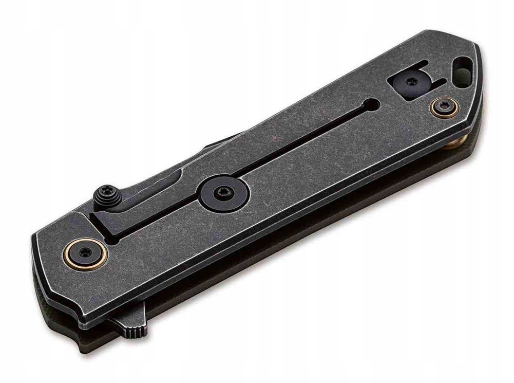 Rama ze stali nierdzewnej, również z wykończeniem w kolorze ciemnego stonewash, niezawodnie zabezpiecza ostrze i jest wyposażona w blokadę Hinderer Lock-Stop. Antypoślizgowy uchwyt pokryty jest z przodu teksturowanym G10 i jest wygodny w trzymaniu.