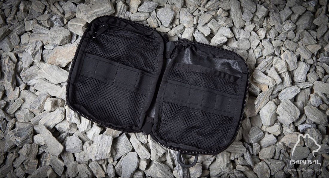 Organizer posiada z przodu kieszonkę o głębokości 1cm, zamykaną na zamek wszyty po skosie. Poniżej panel rzep na taśmach w systemie molle tworzy przestrzeń do zagospodarowania naszywkami. Po bokach znajdują się gumki na długopisy, lightsticki, krzesiwa, małe kubotany itp. Wewnątrz - kolejna kieszeń, na całej wielkości ścianki, zamykana na zamek. Dzięki siatce widać co znajduje się w środku. Na kieszonce naszyta guma tworząca przegródki o szerokoścachi: 6,5cm; 3,75cm; 2,75cm. Z boku organizera - praktyczna rączka z taśmy. Po drugiej stronie organizera znajduje się kolejna kieszonka siatki oraz guma, ale przeszyta gęściej niż ta na przedniej stronie: 5cm, 4cm; 2,5cm; 1,5cm.