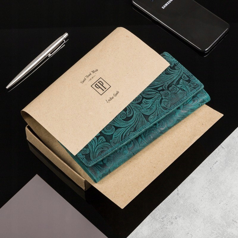 Świąteczny zestaw prezentowy dla Niej Klasyczny model saszetki damskiej T-36 w kolorze turkusowym, wykonany ze skóry naturalnej postarzanej. Ten wytrzymały materiał, na którego powierzchni wraz z intensywnością użytkowania tworzą się nadające indywidualnego charakteru vintage zarysowania, przypadnie do gustu wszystkim miłośniczkom stylu retro. Pakowna komora główna pomieści najważniejsze przedmioty, które powinnaś mieć zawsze pod ręką - portfel, smartphone czy dokumenty. Dzięki regulowanemu paskowi możesz dopasować nerkę do swoich preferencji i nosić ją tak, jak lubisz - na ramię, na skos i na pas. Charakterystyka saszetki T-36-GR Model: T-36-GRProducent: Paolo PeruzziMateriał: skóra naturalnaKolor: turkusowyZapięcie: metalowy suwakUchwyt: regulowany pasekIlość komór: 1Ilość kieszeni: 2Miejsce na telefon: takMieści A4: nie Wymiary Wysokość: 17,5 cmSzerokość: 26,5 cm (mierzone u góry)Głębokość: ok. 7 cmDługość paska: max. 135 cm Duży portfel damski z postarzanej skóry naturalnej w kolorze butelkowej zieleni, orientacja pozioma. Wewnątrz dwie przegrody na banknoty, kieszeń na bilon oraz 20 przegródek na karty kredytowe. Dodatkowo kieszeń na suwak na tyle portfela i dwa schowki, w tym jeden transparentny. Wewnątrz warstwa ochronna RFID, zapobiegająca kradzieży danych. Idealny prezent dla kobiety w każdym wieku, która poszukuje pakownego portfela. Charakterystyka portfela T-25-GRProducent: Paolo PeruzziModel: T-25-GRMateriał: skóra naturalna z efektem postarzeniaWzór: roślinny Kolor: butelkowa zieleńOrientacja: poziomaIlość przegródek na karty: 20Ilość schowków: 2 (w tym jeden transparentny)Przegroda na banknoty: 2Kieszeń na bilon: tak, na suwakWarstwa ochronna RFID: takPudełko prezentowe: tak WymiaryWysokość: 10 cmSzerokość: 20 cmGrubość: ok. 3 cm