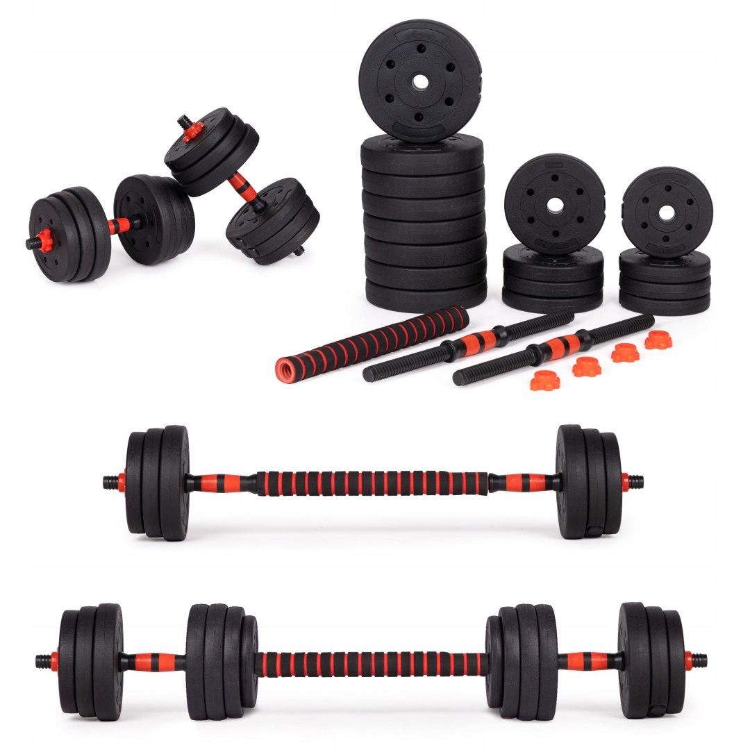 W skład zestaw wchodzi16 talerzy, dzięki którym można dostosować ciężar do wykonywanego treningu. Uchwyt hantli jest wyprofilowany i zapewnia mocny chwyt podczas wykonywanych ćwiczeń.