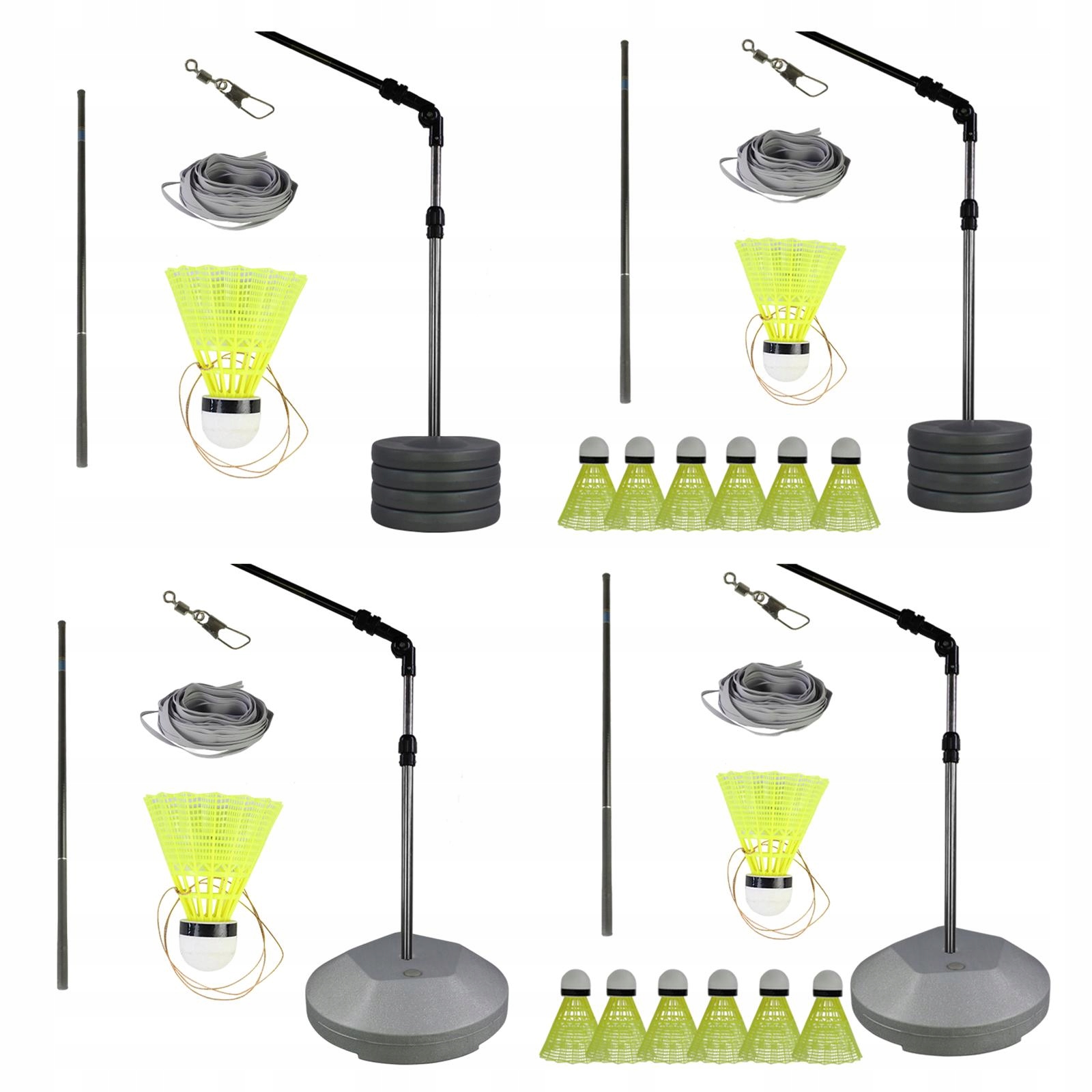 Sposób użycia: najpierw napełnij podstawę wodą lub piaskiem, a następnie podłącz trzy podstawy razem z akcesoriami, podłącz adapter, podłącz sznurek do słupa, podłącz drugi koniec do specjalnego badmintona, I wreszcie podłącz długi biegun do podstawy. Rozpocząć pracę razem.