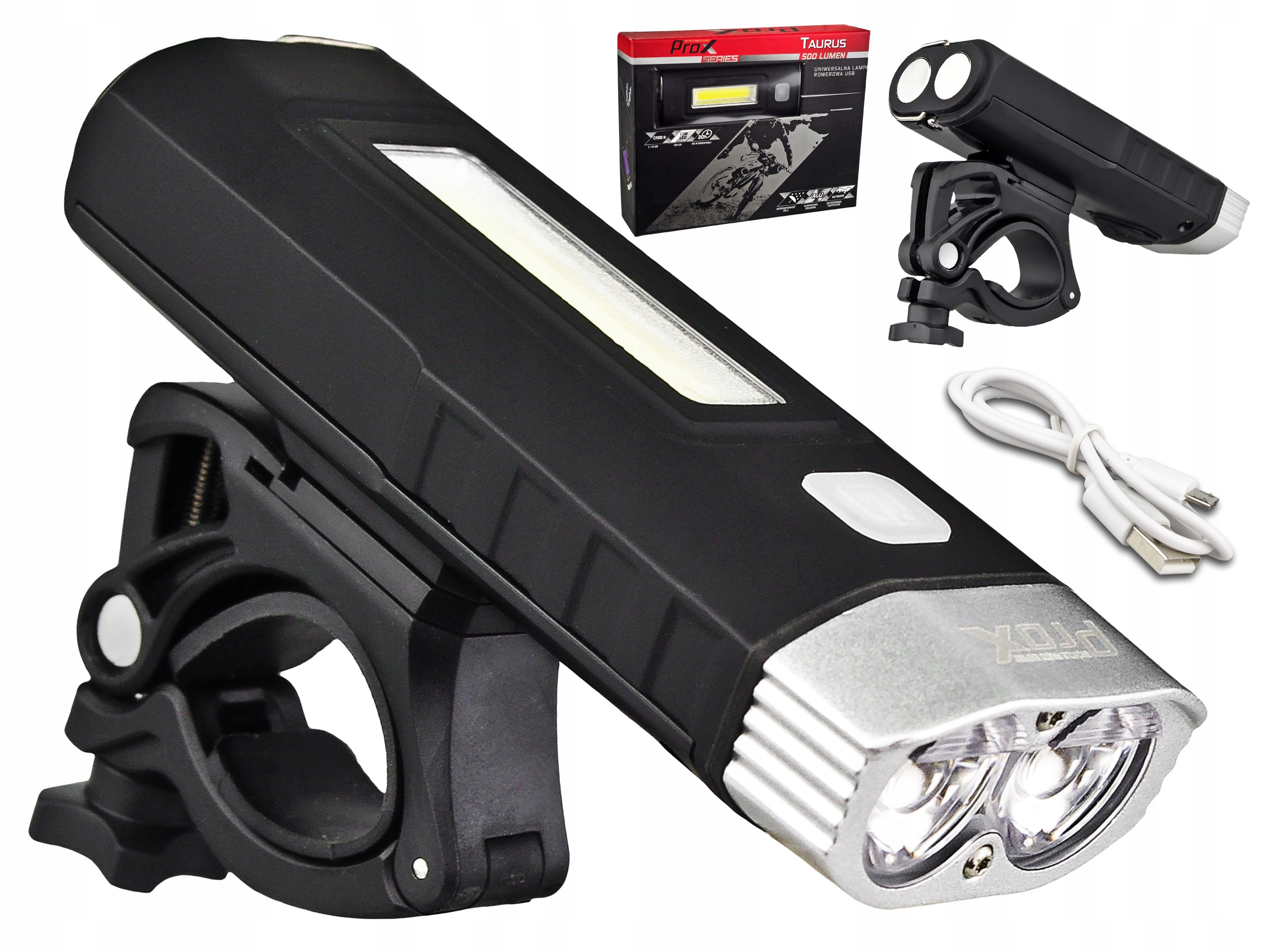 Przednia lampka PROX TAURUS została wyposażona w dwie mocne diody T6 LED o mocy 500 LM i jedną COB LED (200 LM). Lampka nie wymaga użycia baterii - zintegrowany akumulator jest ładowany przy pomocy dołączonego do zestawu kabla USB.