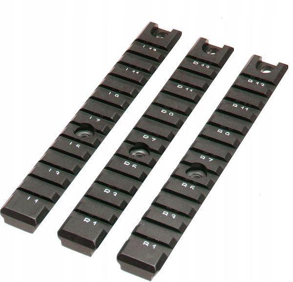 Komplet trzech szyn montażowych (Weaver). Wyprodukowany z bardzo twardych a zarazem lekkich lotniczych stopów aluminium, dodatkowo oksydowany. W szynie znajdują się dwa otwory, oraz ponumerowane sloty. Długość szyn 15,5 cm.