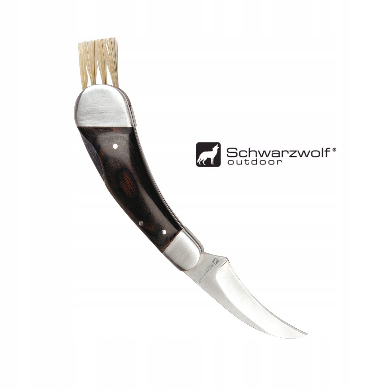 Nóż do zbierania grzybów marki Schwarzwolf, wykonany ze stali nierdzewnej i drewna, wyposażony w pędzelek do czyszczenia grzybów.