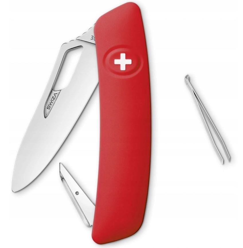 Scyzoryk szwajcarski firmy Swiza w kolorze czerwonym to klasycznypomysł na prezent dla każdego mężczyzny. Jego cechą charakterystyczną jest jego intensywny, głęboki czerwony kolor. Scyzoryk wyposażony jest w wysokiej jakości ostrze ze stali nierdzewnej o długości 75mm, które może być otworzone jedną ręką. Wysoka jakość materiału, z którego jest wykonany sprawia, że będzie służył obdarowanemu przez wiele lat. Wśród narzędzi znajdziesz również dziurkacz i pęsetę, które mogą okazać się przydatne podczas wykonywania prac domowych lub biurowych.