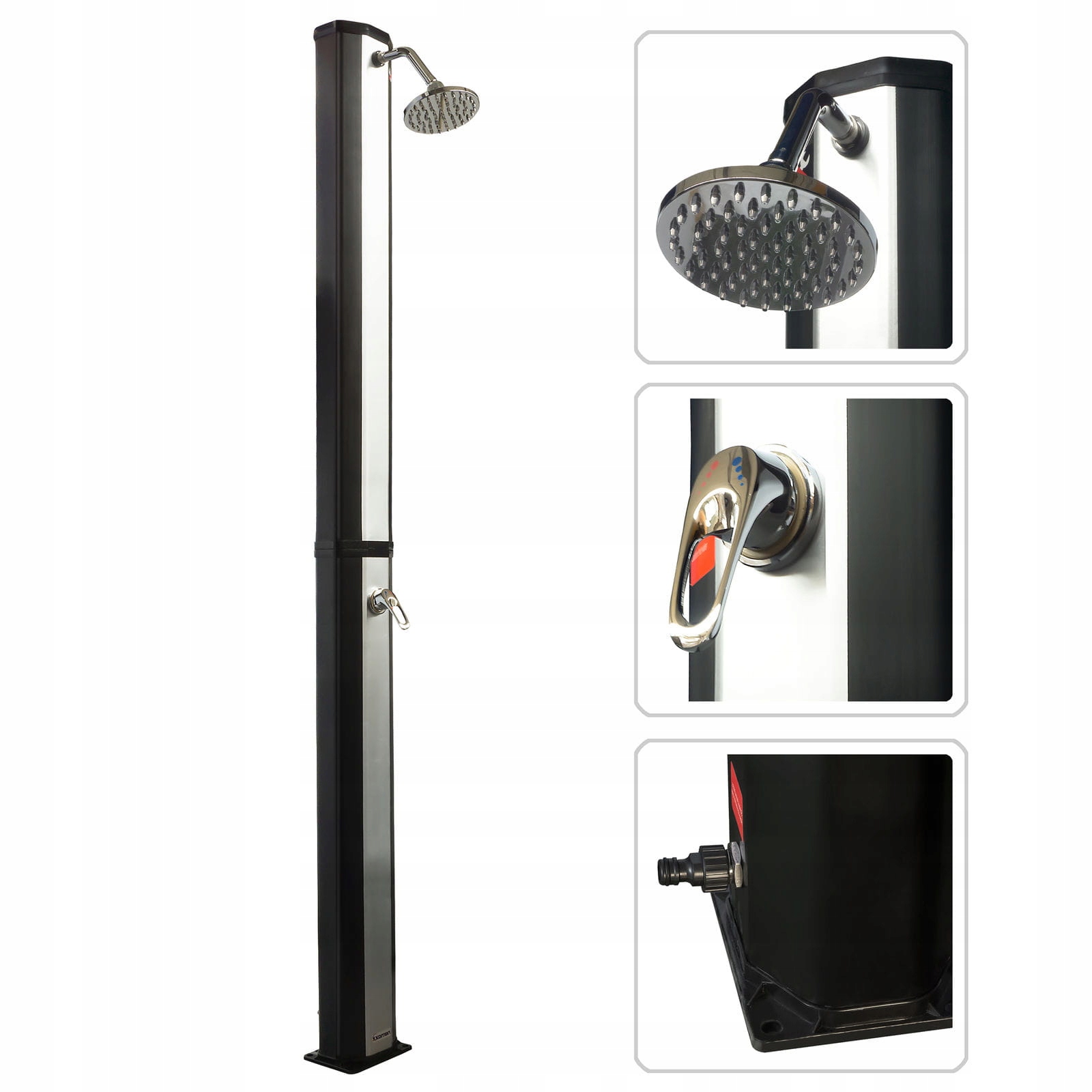 Zasilany energią słoneczną prysznic wykorzystasz na zewnątrz przed lub po relaksującej kąpieli w basenie. Z łatwością podłączysz go do węża ogrodowego lub zbiornika z wodą. Zebrana woda będzie ogrzana skumulowaną energią słoneczną, a jej temperatura sięgnie nawet 60°C. Dodatkowymi zaletami będą słuchawka i kran. Zapewniamy również 4 śruby, by zamontować prysznic do podłoża. Estetyczny wygląd z łatwością wpasuje się w teren wokół basenu. Cały prysznic wykonany jest z materiału PVC, a jego front wykonany jest na wzór listwy aluminiowej.