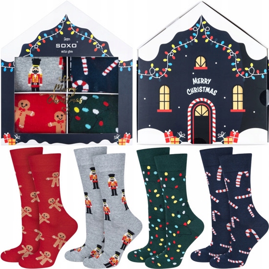 - Zestaw świątecznych skarpetek jest zapakowany w piękne pudełko w kształcie domku z piernika. Dzięki temu staje się wspaniałym prezentem na Święta, gotowym do wręczenia.