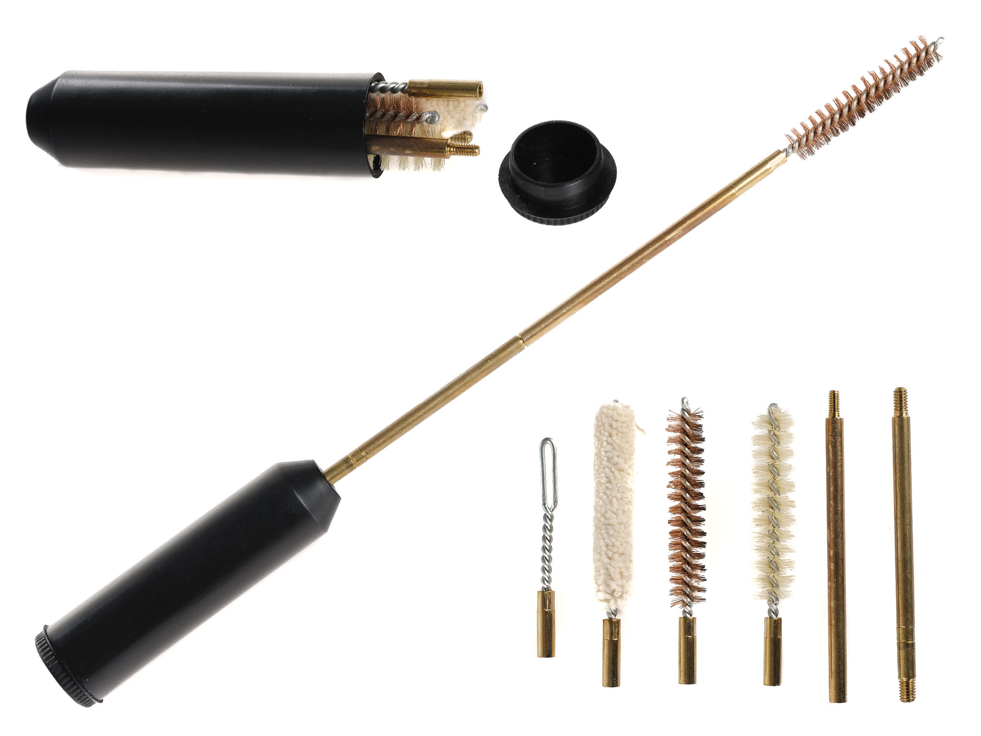 Składany i chowany w pojemniku/rękojeści z wytrzymałego tworzywa. Niewielkie gabaryty po złożeniu, wielkość standardowego magazynka pistoletowego (możliwość noszenia w ładownicy). Cztery wymienne końcówki umożliwią wyczyszczenie nawet mocno zabrudzonej broni, ułatwią pozbyć się zapieczeń, ognisk rdzy i wżerów w lufie. Miękka końcówka bawełniana do wycierania i polerowania oraz usuwania lekkich osadów prochowych. Półsztywna szczotka ze sztucznego włosia, doskonała do szorowania. Szczotka z drutów mosiężnych do najbardziej uporczywych zabrudzeń, usuwa ogniska rdzy i wżery - mosiądz jest mniej twardy od stali więc nie ma ryzyka zarysowania lufy. Wąska końcówka z oczkiem na pakuły lub fragmenty tkaniny - idealna do czyszczenia także trudno dostępnych miejsc. Dwie przedłużki mosiężne pozwolą dopasować długość wyciora do lufy. Jedna z przedłużek wyposażona w mechanizm obrotowy - umożliwia "wkręcanie" się szczotek w lufę zgodnie z bruzdami (gwintem lufy).