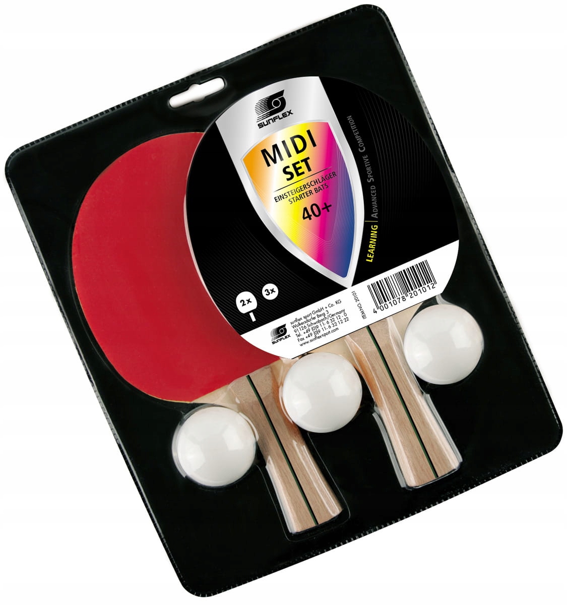 Zestaw do tenisa stołowego SUNFLEX MIDI z 2 rakietkami midi i 3 piłkami TT, plastikowa piłka 40+. Na blistrze.