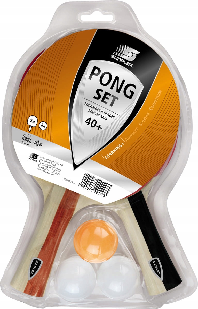 Zestaw do tenisa stołowego SUNFLEX PONG z 2 rakietkami treningowymi, wypustkami na gąbce 1,0 mm, 3 plastikowymi piłeczkami 40+, wklęsłą rączką, zapakowane w blistrze