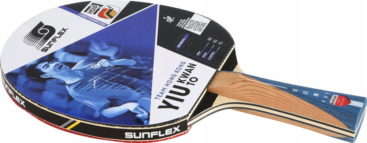 Rakietka do tenisa stołowego SUNFLEX YIU KWAN TO z gąbką 2,1 mm, gumą Mikado, zatwierdzoną przez ITTF, wewnętrzną warstwą o wysokiej gęstości i wklęsłą rączką.