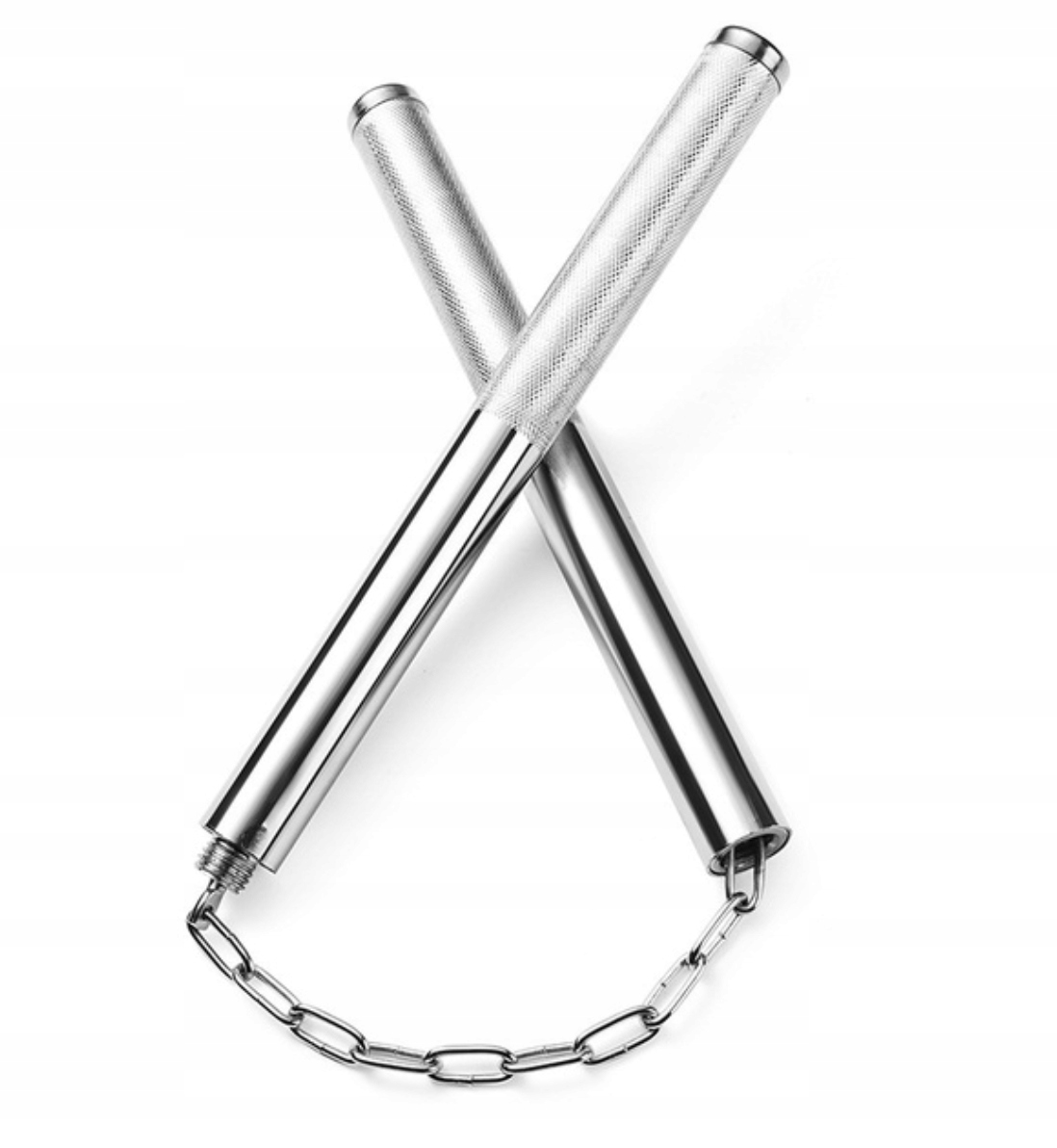 - Nunchaku ma pałki wykonane z ze stali nierdzewnej która skręcana jest w pałkę, łańcuch chowa się w jednej z pałek i po skręceniu powstaje duża jedna solidna pałka.