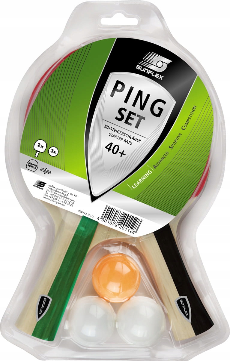 Zestaw do tenisa stołowego SUNFLEX PING z 2 rakietkami TT, czopy w środku, bez gąbki, 3 plastikowe piłeczki 40+, wklęsła rączka, zapakowane w blistrze.