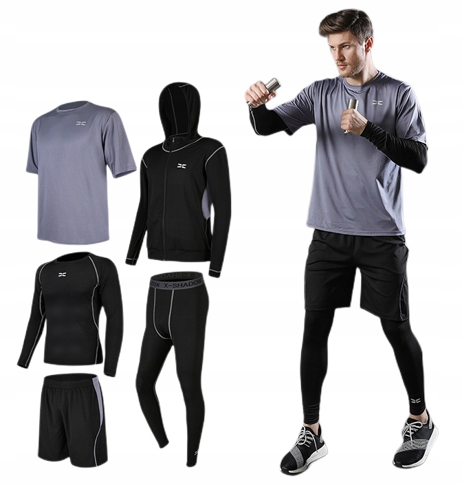 - Zestaw 5 sztuk męskich odzieży sportowej, sportowy strój z Outwear, koszulka z długim rękawem, wąskie spodnie, koszulka z krótkim rękawem, szorty.