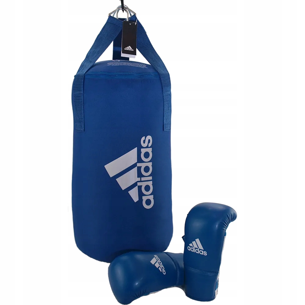 Zestaw bokserski Adidas Blue Corner Kit | składa się z wytrzymałego worka treningowego i pary juniorskich rękawic bokserskich. Worek, którego wysokość wynosi około 55 cm wykonany jest z wysokiej jakości tkaniny poliestrowej, mieszanki bawełny i specjalistycznego materiału spadochronowego. Wypełnienie tekstylne (wsad) ładowane jest maszynowo, aby mieć jednolitą strukturę i równą średnicę na całej długości worka, od góry do dołu. Model ten oferuje średnicę ∅28 cm.